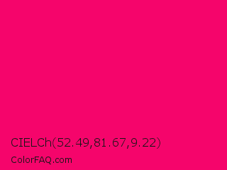 CIELCh 52.49,81.67,9.22 Color is a normal rose color and the nearest color is Vivid Raspberry #ff006c. Hex code #f5056b and RGB value is rgb(245,5,107). In RGB color space, this color is composed of 96% red, 2% green, 42% blue, In CMYK color space, this color is composed of 0% cyan, 98% magenta, 56% yellow , 4% black , In HSL color space, this color has a hue angle of 335° , 96% saturation and 49% lightness.