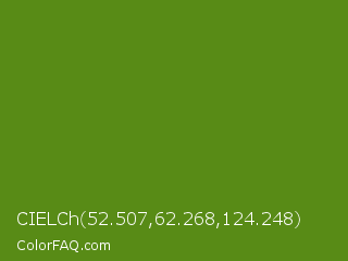 CIELCh 52.507,62.268,124.248 Color is a normal green color and the nearest color is Vida Loca #549019. Hex code #588b16 and RGB value is rgb(88,139,22). In RGB color space, this color is composed of 35% red, 55% green, 9% blue, In CMYK color space, this color is composed of 37% cyan, 0% magenta, 84% yellow , 45% black , In HSL color space, this color has a hue angle of 86° , 73% saturation and 32% lightness.