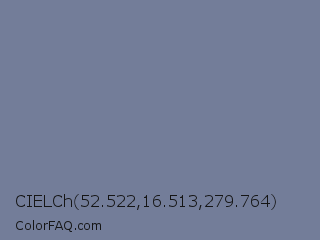 CIELCh 52.522,16.513,279.764 Color is a normal blue color and the nearest color is Rhythm #777696. Hex code #737d99 and RGB value is rgb(115,125,153). In RGB color space, this color is composed of 45% red, 49% green, 60% blue, In CMYK color space, this color is composed of 25% cyan, 18% magenta, 0% yellow , 40% black , In HSL color space, this color has a hue angle of 224° , 16% saturation and 53% lightness.