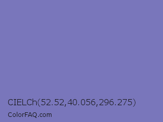 CIELCh 52.52,40.056,296.275 Color is a normal indigo color and the nearest color is Toolbox #746cc0. Hex code #7976bb and RGB value is rgb(121,118,187). In RGB color space, this color is composed of 47% red, 46% green, 73% blue, In CMYK color space, this color is composed of 35% cyan, 37% magenta, 0% yellow , 27% black , In HSL color space, this color has a hue angle of 243° , 34% saturation and 60% lightness.