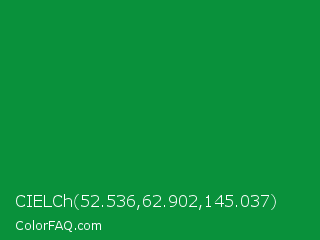 CIELCh 52.536,62.902,145.037 Color is a dark green color and the nearest color is North Texas Green #059033. Hex code #09913b and RGB value is rgb(9,145,59). In RGB color space, this color is composed of 4% red, 57% green, 23% blue, In CMYK color space, this color is composed of 94% cyan, 0% magenta, 59% yellow , 43% black , In HSL color space, this color has a hue angle of 142° , 88% saturation and 30% lightness.