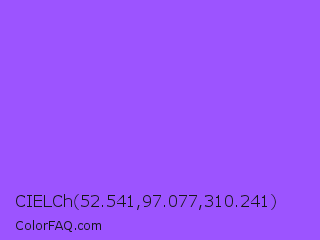 CIELCh 52.541,97.077,310.241 Color is a light violet color and the nearest color is Navy Purple #9457eb. Hex code #9c54ff and RGB value is rgb(156,84,255). In RGB color space, this color is composed of 61% red, 33% green, 100% blue, In CMYK color space, this color is composed of 39% cyan, 67% magenta, 0% yellow , 0% black , In HSL color space, this color has a hue angle of 265° , 100% saturation and 66% lightness.