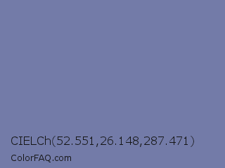CIELCh 52.551,26.148,287.471 Color is a normal blue color and the nearest color is Shadow Blue #778ba5. Hex code #737ba8 and RGB value is rgb(115,123,168). In RGB color space, this color is composed of 45% red, 48% green, 66% blue, In CMYK color space, this color is composed of 32% cyan, 27% magenta, 0% yellow , 34% black , In HSL color space, this color has a hue angle of 231° , 23% saturation and 55% lightness.