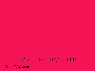 CIELCh 52.55,82.102,17.944 Color is a normal rose color and the nearest color is Awesome #ff2052. Hex code #f51557 and RGB value is rgb(245,21,87). In RGB color space, this color is composed of 96% red, 8% green, 34% blue, In CMYK color space, this color is composed of 0% cyan, 91% magenta, 64% yellow , 4% black , In HSL color space, this color has a hue angle of 342° , 92% saturation and 52% lightness.