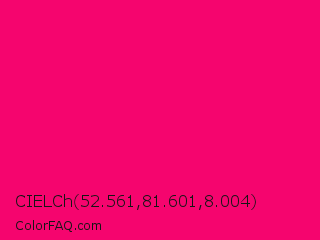 CIELCh 52.561,81.601,8.004 Color is a normal rose color and the nearest color is Vivid Raspberry #ff006c. Hex code #f5056e and RGB value is rgb(245,5,110). In RGB color space, this color is composed of 96% red, 2% green, 43% blue, In CMYK color space, this color is composed of 0% cyan, 98% magenta, 55% yellow , 4% black , In HSL color space, this color has a hue angle of 334° , 96% saturation and 49% lightness.
