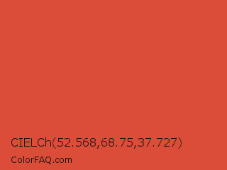 CIELCh 52.568,68.75,37.727 Color is a normal red color and the nearest color is Valencia #d84437. Hex code #db4d38 and RGB value is rgb(219,77,56). In RGB color space, this color is composed of 86% red, 30% green, 22% blue, In CMYK color space, this color is composed of 0% cyan, 65% magenta, 74% yellow , 14% black , In HSL color space, this color has a hue angle of 8° , 69% saturation and 54% lightness.