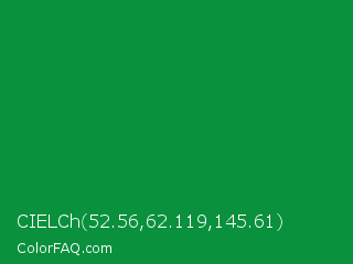 CIELCh 52.56,62.119,145.61 Color is a dark green color and the nearest color is North Texas Green #059033. Hex code #09913d and RGB value is rgb(9,145,61). In RGB color space, this color is composed of 4% red, 57% green, 24% blue, In CMYK color space, this color is composed of 94% cyan, 0% magenta, 58% yellow , 43% black , In HSL color space, this color has a hue angle of 143° , 88% saturation and 30% lightness.