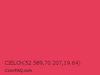 CIELCh 52.589,70.207,19.64 Color is a normal red color and the nearest color is Desire #ea3c53. Hex code #e63b59 and RGB value is rgb(230,59,89). In RGB color space, this color is composed of 90% red, 23% green, 35% blue, In CMYK color space, this color is composed of 0% cyan, 74% magenta, 61% yellow , 10% black , In HSL color space, this color has a hue angle of 349° , 77% saturation and 57% lightness.