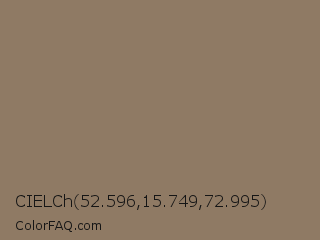 CIELCh 52.596,15.749,72.995 Color is a normal orange color and the nearest color is Cement #8d7662. Hex code #8f7a64 and RGB value is rgb(143,122,100). In RGB color space, this color is composed of 56% red, 48% green, 39% blue, In CMYK color space, this color is composed of 0% cyan, 15% magenta, 30% yellow , 44% black , In HSL color space, this color has a hue angle of 31° , 18% saturation and 48% lightness.