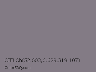 CIELCh 52.603,6.629,319.107 Color is a normal purple color and the nearest color is Jumbo #7c7b82. Hex code #837b85 and RGB value is rgb(131,123,133). In RGB color space, this color is composed of 51% red, 48% green, 52% blue, In CMYK color space, this color is composed of 2% cyan, 8% magenta, 0% yellow , 48% black , In HSL color space, this color has a hue angle of 288° , 4% saturation and 50% lightness.