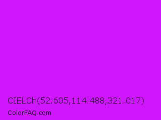 CIELCh 52.605,114.488,321.017 Color is a normal purple color and the nearest color is Vivid Orchid #cc00ff. Hex code #ce15fc and RGB value is rgb(206,21,252). In RGB color space, this color is composed of 81% red, 8% green, 99% blue, In CMYK color space, this color is composed of 18% cyan, 92% magenta, 0% yellow , 1% black , In HSL color space, this color has a hue angle of 288° , 97% saturation and 54% lightness.