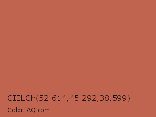 CIELCh 52.614,45.292,38.599 Color is a normal red color and the nearest color is Cedar Chest #c95a49. Hex code #c0634f and RGB value is rgb(192,99,79). In RGB color space, this color is composed of 75% red, 39% green, 31% blue, In CMYK color space, this color is composed of 0% cyan, 48% magenta, 59% yellow , 25% black , In HSL color space, this color has a hue angle of 11° , 47% saturation and 53% lightness.