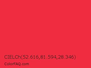 CIELCh 52.616,81.594,28.346 Color is a normal red color and the nearest color is Imperial Red #ed2939. Hex code #f02c40 and RGB value is rgb(240,44,64). In RGB color space, this color is composed of 94% red, 17% green, 25% blue, In CMYK color space, this color is composed of 0% cyan, 82% magenta, 73% yellow , 6% black , In HSL color space, this color has a hue angle of 354° , 87% saturation and 56% lightness.