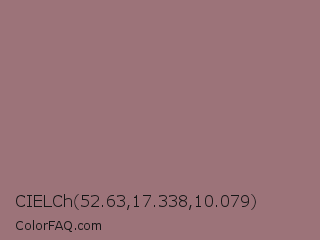 CIELCh 52.63,17.338,10.079 Color is a normal red color and the nearest color is Bazaar #98777b. Hex code #9c7379 and RGB value is rgb(156,115,121). In RGB color space, this color is composed of 61% red, 45% green, 47% blue, In CMYK color space, this color is composed of 0% cyan, 26% magenta, 22% yellow , 39% black , In HSL color space, this color has a hue angle of 351° , 17% saturation and 53% lightness.