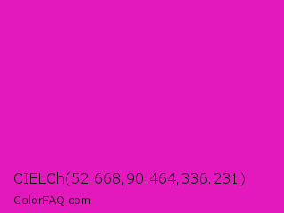 CIELCh 52.668,90.464,336.231 Color is a normal magenta color and the nearest color is Shocking Pink #fc0fc0. Hex code #e319be and RGB value is rgb(227,25,190). In RGB color space, this color is composed of 89% red, 10% green, 75% blue, In CMYK color space, this color is composed of 0% cyan, 89% magenta, 16% yellow , 11% black , In HSL color space, this color has a hue angle of 311° , 80% saturation and 49% lightness.