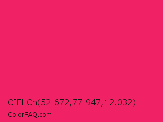 CIELCh 52.672,77.947,12.032 Color is a normal rose color and the nearest color is Razzmatazz #e3256b. Hex code #f12166 and RGB value is rgb(241,33,102). In RGB color space, this color is composed of 95% red, 13% green, 40% blue, In CMYK color space, this color is composed of 0% cyan, 86% magenta, 58% yellow , 5% black , In HSL color space, this color has a hue angle of 340° , 88% saturation and 54% lightness.