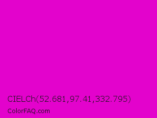 CIELCh 52.681,97.41,332.795 Color is a normal magenta color and the nearest color is Deep Magenta #cc00cc. Hex code #e303cc and RGB value is rgb(227,3,204). In RGB color space, this color is composed of 89% red, 1% green, 80% blue, In CMYK color space, this color is composed of 0% cyan, 99% magenta, 10% yellow , 11% black , In HSL color space, this color has a hue angle of 306° , 97% saturation and 45% lightness.