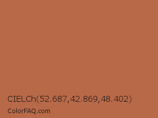 CIELCh 52.687,42.869,48.402 Color is a normal orange color and the nearest color is Brown Sugar #af6e4d. Hex code #b86948 and RGB value is rgb(184,105,72). In RGB color space, this color is composed of 72% red, 41% green, 28% blue, In CMYK color space, this color is composed of 0% cyan, 43% magenta, 61% yellow , 28% black , In HSL color space, this color has a hue angle of 18° , 44% saturation and 50% lightness.