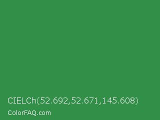 CIELCh 52.692,52.671,145.608 Color is a normal green color and the nearest color is Sea Green #2e8b57. Hex code #318f48 and RGB value is rgb(49,143,72). In RGB color space, this color is composed of 19% red, 56% green, 28% blue, In CMYK color space, this color is composed of 66% cyan, 0% magenta, 50% yellow , 44% black , In HSL color space, this color has a hue angle of 135° , 49% saturation and 38% lightness.