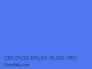CIELCh 52.693,69.79,290.793 Color is a light blue color and the nearest color is Blueberry #4f86f7. Hex code #4d76ef and RGB value is rgb(77,118,239). In RGB color space, this color is composed of 30% red, 46% green, 94% blue, In CMYK color space, this color is composed of 68% cyan, 51% magenta, 0% yellow , 6% black , In HSL color space, this color has a hue angle of 225° , 84% saturation and 62% lightness.