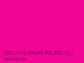 CIELCh 52.699,83.493,352.101 Color is a normal magenta color and the nearest color is Hollywood Cerise #f400a1. Hex code #f00594 and RGB value is rgb(240,5,148). In RGB color space, this color is composed of 94% red, 2% green, 58% blue, In CMYK color space, this color is composed of 0% cyan, 98% magenta, 38% yellow , 6% black , In HSL color space, this color has a hue angle of 323° , 96% saturation and 48% lightness.