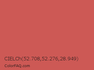 CIELCh 52.708,52.276,28.949 Color is a normal red color and the nearest color is Chestnut Rose #cd5c5c. Hex code #cd5955 and RGB value is rgb(205,89,85). In RGB color space, this color is composed of 80% red, 35% green, 33% blue, In CMYK color space, this color is composed of 0% cyan, 57% magenta, 59% yellow , 20% black , In HSL color space, this color has a hue angle of 2° , 55% saturation and 57% lightness.