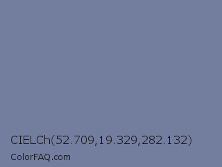 CIELCh 52.709,19.329,282.132 Color is a normal blue color and the nearest color is Lynch #697e9a. Hex code #737d9e and RGB value is rgb(115,125,158). In RGB color space, this color is composed of 45% red, 49% green, 62% blue, In CMYK color space, this color is composed of 27% cyan, 21% magenta, 0% yellow , 38% black , In HSL color space, this color has a hue angle of 226° , 18% saturation and 54% lightness.