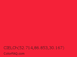 CIELCh 52.714,86.853,30.167 Color is a normal red color and the nearest color is Imperial Red #ed2939. Hex code #f52138 and RGB value is rgb(245,33,56). In RGB color space, this color is composed of 96% red, 13% green, 22% blue, In CMYK color space, this color is composed of 0% cyan, 87% magenta, 77% yellow , 4% black , In HSL color space, this color has a hue angle of 353° , 91% saturation and 55% lightness.