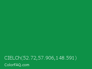 CIELCh 52.72,57.906,148.591 Color is a normal green color and the nearest color is Spanish Green #009150. Hex code #0d9147 and RGB value is rgb(13,145,71). In RGB color space, this color is composed of 5% red, 57% green, 28% blue, In CMYK color space, this color is composed of 91% cyan, 0% magenta, 51% yellow , 43% black , In HSL color space, this color has a hue angle of 146° , 84% saturation and 31% lightness.