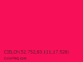 CIELCh 52.752,83.111,17.528 Color is a normal rose color and the nearest color is Folly #ff004f. Hex code #f70f58 and RGB value is rgb(247,15,88). In RGB color space, this color is composed of 97% red, 6% green, 35% blue, In CMYK color space, this color is composed of 0% cyan, 94% magenta, 64% yellow , 3% black , In HSL color space, this color has a hue angle of 341° , 94% saturation and 51% lightness.