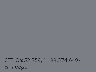 CIELCh 52.759,4.199,274.649 Color is a normal blue color and the nearest color is Jumbo #7c7b82. Hex code #7b7e85 and RGB value is rgb(123,126,133). In RGB color space, this color is composed of 48% red, 49% green, 52% blue, In CMYK color space, this color is composed of 8% cyan, 5% magenta, 0% yellow , 48% black , In HSL color space, this color has a hue angle of 222° , 4% saturation and 50% lightness.