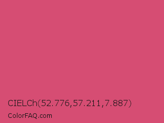 CIELCh 52.776,57.211,7.887 Color is a normal rose color and the nearest color is Cabaret #d94972. Hex code #d64d73 and RGB value is rgb(214,77,115). In RGB color space, this color is composed of 84% red, 30% green, 45% blue, In CMYK color space, this color is composed of 0% cyan, 64% magenta, 46% yellow , 16% black , In HSL color space, this color has a hue angle of 343° , 63% saturation and 57% lightness.