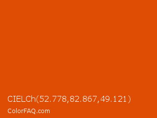 CIELCh 52.778,82.867,49.121 Color is a normal orange color and the nearest color is Trinidad #e64e03. Hex code #de4d03 and RGB value is rgb(222,77,3). In RGB color space, this color is composed of 87% red, 30% green, 1% blue, In CMYK color space, this color is composed of 0% cyan, 65% magenta, 99% yellow , 13% black , In HSL color space, this color has a hue angle of 20° , 97% saturation and 44% lightness.