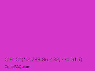 CIELCh 52.788,86.432,330.315 Color is a normal magenta color and the nearest color is Steel Pink #cc33cc. Hex code #d436c9 and RGB value is rgb(212,54,201). In RGB color space, this color is composed of 83% red, 21% green, 79% blue, In CMYK color space, this color is composed of 0% cyan, 75% magenta, 5% yellow , 17% black , In HSL color space, this color has a hue angle of 304° , 65% saturation and 52% lightness.
