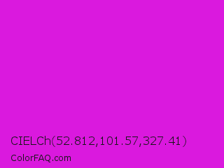 CIELCh 52.812,101.57,327.41 Color is a normal magenta color and the nearest color is Deep Magenta #cc00cc. Hex code #da19de and RGB value is rgb(218,25,222). In RGB color space, this color is composed of 85% red, 10% green, 87% blue, In CMYK color space, this color is composed of 2% cyan, 89% magenta, 0% yellow , 13% black , In HSL color space, this color has a hue angle of 299° , 80% saturation and 48% lightness.