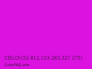 CIELCh 52.812,103.283,327.275 Color is a normal magenta color and the nearest color is Deep Magenta #cc00cc. Hex code #db12e0 and RGB value is rgb(219,18,224). In RGB color space, this color is composed of 86% red, 7% green, 88% blue, In CMYK color space, this color is composed of 2% cyan, 92% magenta, 0% yellow , 12% black , In HSL color space, this color has a hue angle of 299° , 85% saturation and 47% lightness.