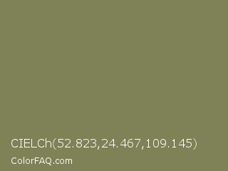 CIELCh 52.823,24.467,109.145 Color is a normal yellow color and the nearest color is Clay Creek #8a8360. Hex code #7f8156 and RGB value is rgb(127,129,86). In RGB color space, this color is composed of 50% red, 51% green, 34% blue, In CMYK color space, this color is composed of 2% cyan, 0% magenta, 33% yellow , 49% black , In HSL color space, this color has a hue angle of 63° , 20% saturation and 42% lightness.