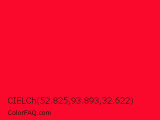 CIELCh 52.825,93.893,32.622 Color is a normal red color and the nearest color is Torch Red #fd0e35. Hex code #fb092c and RGB value is rgb(251,9,44). In RGB color space, this color is composed of 98% red, 4% green, 17% blue, In CMYK color space, this color is composed of 0% cyan, 96% magenta, 82% yellow , 2% black , In HSL color space, this color has a hue angle of 351° , 97% saturation and 51% lightness.
