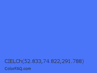 CIELCh 52.833,74.822,291.788 Color is a light blue color and the nearest color is Ultramarine Blue #4166f5. Hex code #4a75f7 and RGB value is rgb(74,117,247). In RGB color space, this color is composed of 29% red, 46% green, 97% blue, In CMYK color space, this color is composed of 70% cyan, 53% magenta, 0% yellow , 3% black , In HSL color space, this color has a hue angle of 225° , 92% saturation and 63% lightness.