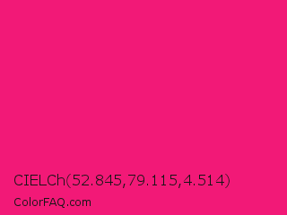CIELCh 52.845,79.115,4.514 Color is a normal rose color and the nearest color is Razzmatazz #e3256b. Hex code #f21977 and RGB value is rgb(242,25,119). In RGB color space, this color is composed of 95% red, 10% green, 47% blue, In CMYK color space, this color is composed of 0% cyan, 90% magenta, 51% yellow , 5% black , In HSL color space, this color has a hue angle of 334° , 89% saturation and 52% lightness.