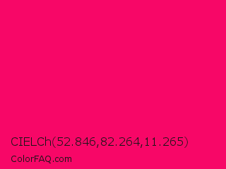 CIELCh 52.846,82.264,11.265 Color is a normal rose color and the nearest color is Vivid Raspberry #ff006c. Hex code #f70767 and RGB value is rgb(247,7,103). In RGB color space, this color is composed of 97% red, 3% green, 40% blue, In CMYK color space, this color is composed of 0% cyan, 97% magenta, 58% yellow , 3% black , In HSL color space, this color has a hue angle of 336° , 94% saturation and 50% lightness.