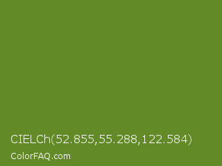 CIELCh 52.855,55.288,122.584 Color is a normal green color and the nearest color is Olive Drab #6b8e23. Hex code #628a26 and RGB value is rgb(98,138,38). In RGB color space, this color is composed of 38% red, 54% green, 15% blue, In CMYK color space, this color is composed of 29% cyan, 0% magenta, 72% yellow , 46% black , In HSL color space, this color has a hue angle of 84° , 57% saturation and 35% lightness.
