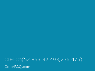 CIELCh 52.863,32.493,236.475 Color is a normal cyan color and the nearest color is Blue Munsell #0093af. Hex code #0889ac and RGB value is rgb(8,137,172). In RGB color space, this color is composed of 3% red, 54% green, 67% blue, In CMYK color space, this color is composed of 95% cyan, 20% magenta, 0% yellow , 33% black , In HSL color space, this color has a hue angle of 193° , 91% saturation and 35% lightness.