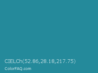CIELCh 52.86,28.18,217.75 Color is a normal cyan color and the nearest color is Jelly Bean #297b9a. Hex code #248a9b and RGB value is rgb(36,138,155). In RGB color space, this color is composed of 14% red, 54% green, 61% blue, In CMYK color space, this color is composed of 77% cyan, 11% magenta, 0% yellow , 39% black , In HSL color space, this color has a hue angle of 189° , 62% saturation and 37% lightness.