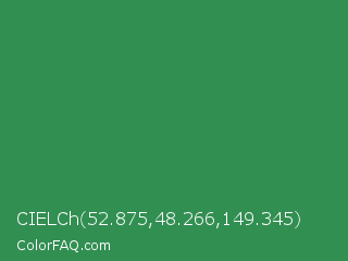 CIELCh 52.875,48.266,149.345 Color is a normal green color and the nearest color is Sea Green #2e8b57. Hex code #328f52 and RGB value is rgb(50,143,82). In RGB color space, this color is composed of 20% red, 56% green, 32% blue, In CMYK color space, this color is composed of 65% cyan, 0% magenta, 43% yellow , 44% black , In HSL color space, this color has a hue angle of 141° , 48% saturation and 38% lightness.