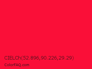 CIELCh 52.896,90.226,29.29 Color is a normal red color and the nearest color is Torch Red #fd0e35. Hex code #fa0f38 and RGB value is rgb(250,15,56). In RGB color space, this color is composed of 98% red, 6% green, 22% blue, In CMYK color space, this color is composed of 0% cyan, 94% magenta, 78% yellow , 2% black , In HSL color space, this color has a hue angle of 350° , 96% saturation and 52% lightness.