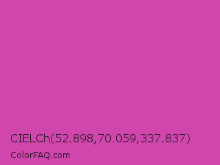 CIELCh 52.898,70.059,337.837 Color is a normal magenta color and the nearest color is Pink Pantone #d74894. Hex code #d146ad and RGB value is rgb(209,70,173). In RGB color space, this color is composed of 82% red, 27% green, 68% blue, In CMYK color space, this color is composed of 0% cyan, 67% magenta, 17% yellow , 18% black , In HSL color space, this color has a hue angle of 316° , 60% saturation and 55% lightness.