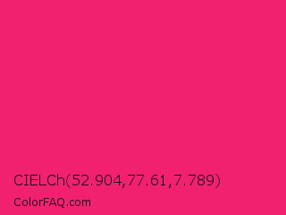 CIELCh 52.904,77.61,7.789 Color is a normal rose color and the nearest color is Razzmatazz #e3256b. Hex code #f12170 and RGB value is rgb(241,33,112). In RGB color space, this color is composed of 95% red, 13% green, 44% blue, In CMYK color space, this color is composed of 0% cyan, 86% magenta, 54% yellow , 5% black , In HSL color space, this color has a hue angle of 337° , 88% saturation and 54% lightness.