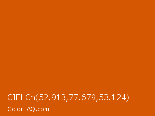CIELCh 52.913,77.679,53.124 Color is a normal orange color and the nearest color is Tenn #cd5700. Hex code #d55702 and RGB value is rgb(213,87,2). In RGB color space, this color is composed of 84% red, 34% green, 1% blue, In CMYK color space, this color is composed of 0% cyan, 59% magenta, 99% yellow , 16% black , In HSL color space, this color has a hue angle of 24° , 98% saturation and 42% lightness.