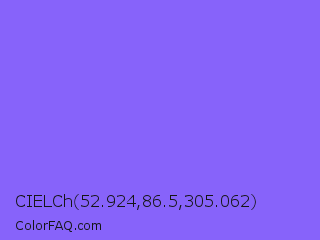 CIELCh 52.924,86.5,305.062 Color is a light indigo color and the nearest color is Medium Slate Blue #7b68ee. Hex code #8763fa and RGB value is rgb(135,99,250). In RGB color space, this color is composed of 53% red, 39% green, 98% blue, In CMYK color space, this color is composed of 46% cyan, 60% magenta, 0% yellow , 2% black , In HSL color space, this color has a hue angle of 254° , 94% saturation and 68% lightness.